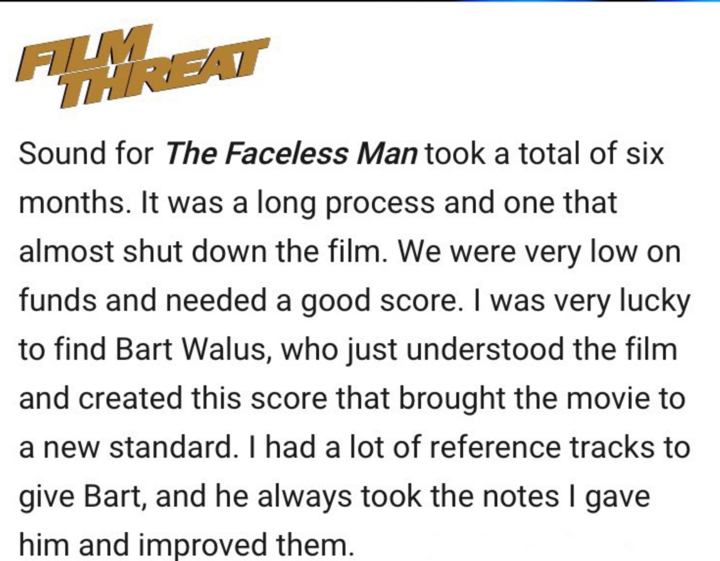 https://filmthreat.com/interviews/james-di-martinos-long-journey-to-create-the-faceless-man/?fbclid=IwAR1XQcbZmumYLZRrW8XJ3maV3PA4OvRxEApZZnll_AK100Q-AVues6zS7Wg